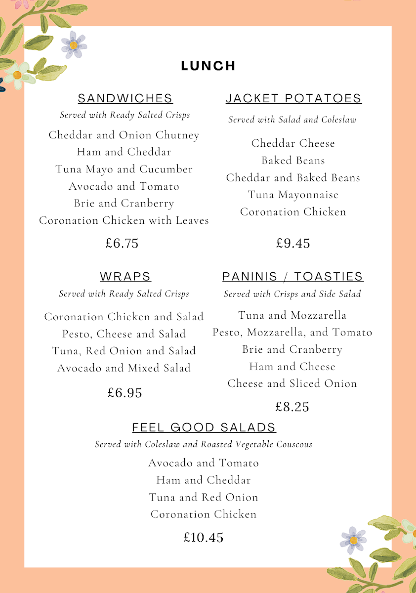The menu at The Rose Petal Café features a delightful range of options, ensuring there's something for everyone. Start your culinary journey with a hearty jacket potato topped with rich cheddar cheese or enjoy the classic combination of baked beans and cheese. For something a little more adventurous, try the Coronation Chicken for a savory delight that tantalizes the taste buds.
